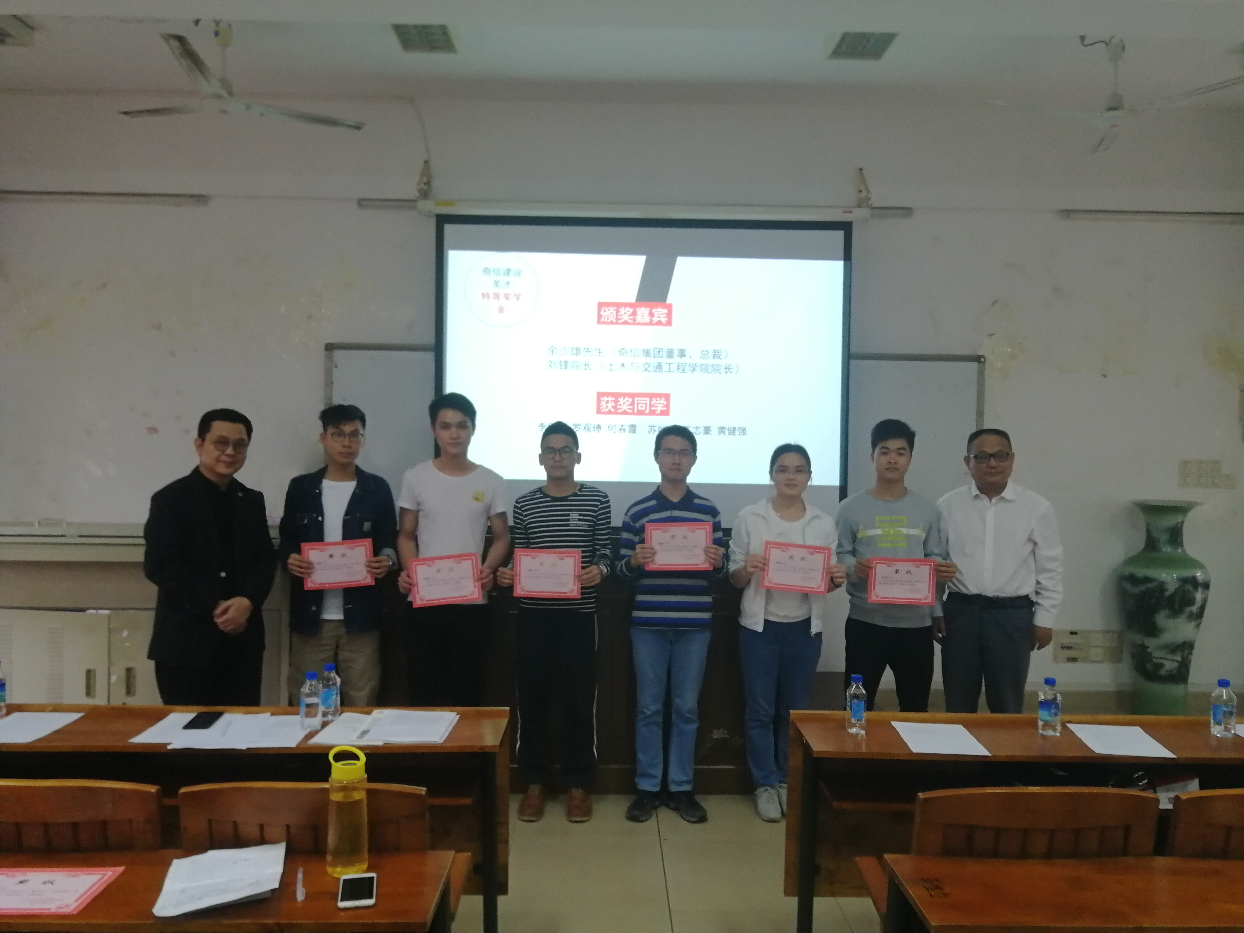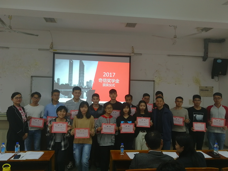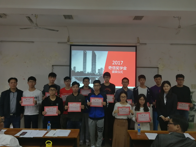 2018年3月14日下午,由深圳奇信建设集团股份有限公司赞助的“奇信奖学金”顺利地在实验二号楼520举行了颁奖仪式。深圳奇信股份董事、总裁余少雄先生、副总裁兼奇信惠州公司总经理谢辉先生、奇信智能化子公司副总经理肖汉先生、奇信总部人资中心张凌女士、奇信惠州公司办学主管邵幻女士,天游ty8检测中心院长刘锋教授、党委郭维喜副书记及学院各级获奖同学出席了本次颁奖仪式。
