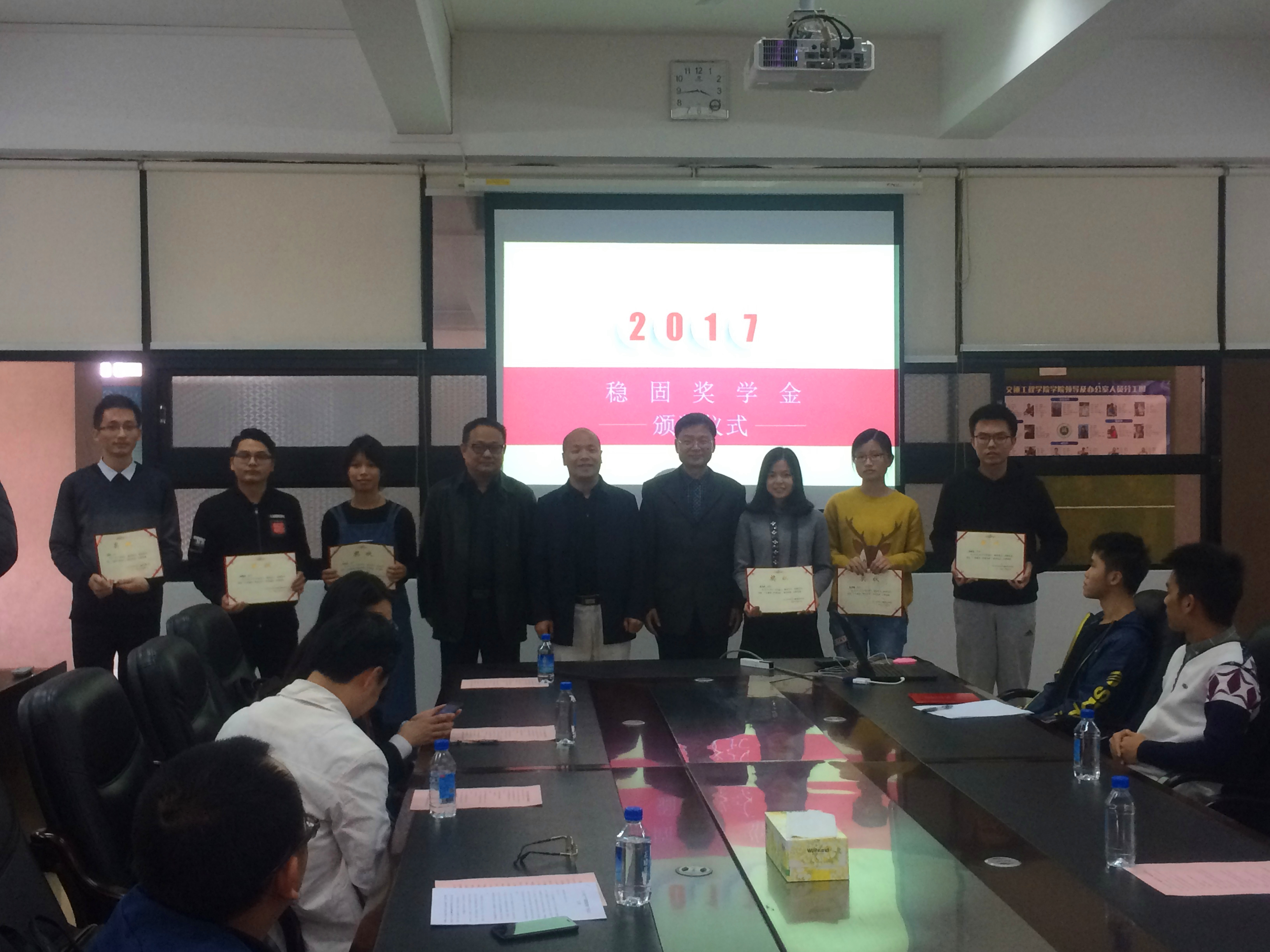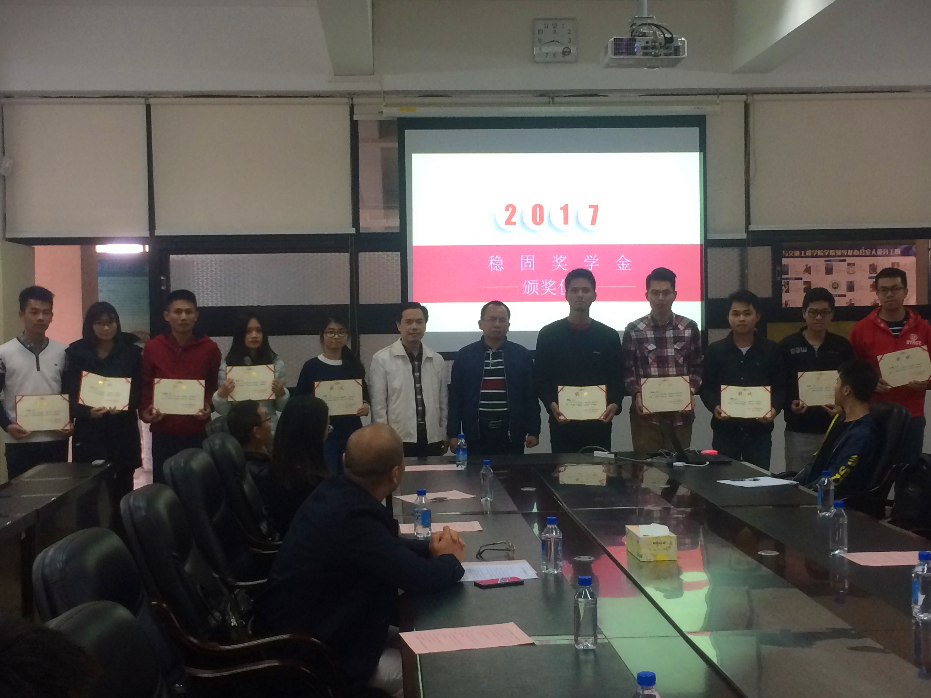 2017年12月26日下午,由广东稳固赞助的“稳固奖学金”顺利地在天游8线路检测中心举行了颁奖仪式。广东稳固董事长邓锦尚先生、副总经理陈水冰先生、副总经理邝炳添先生、办公室主任何海燕女士、办公室副主任颜川茗先生,天游ty8检测中心刘锋院长、党委徐向东书记及学院各级师生出席了本次颁奖仪式。